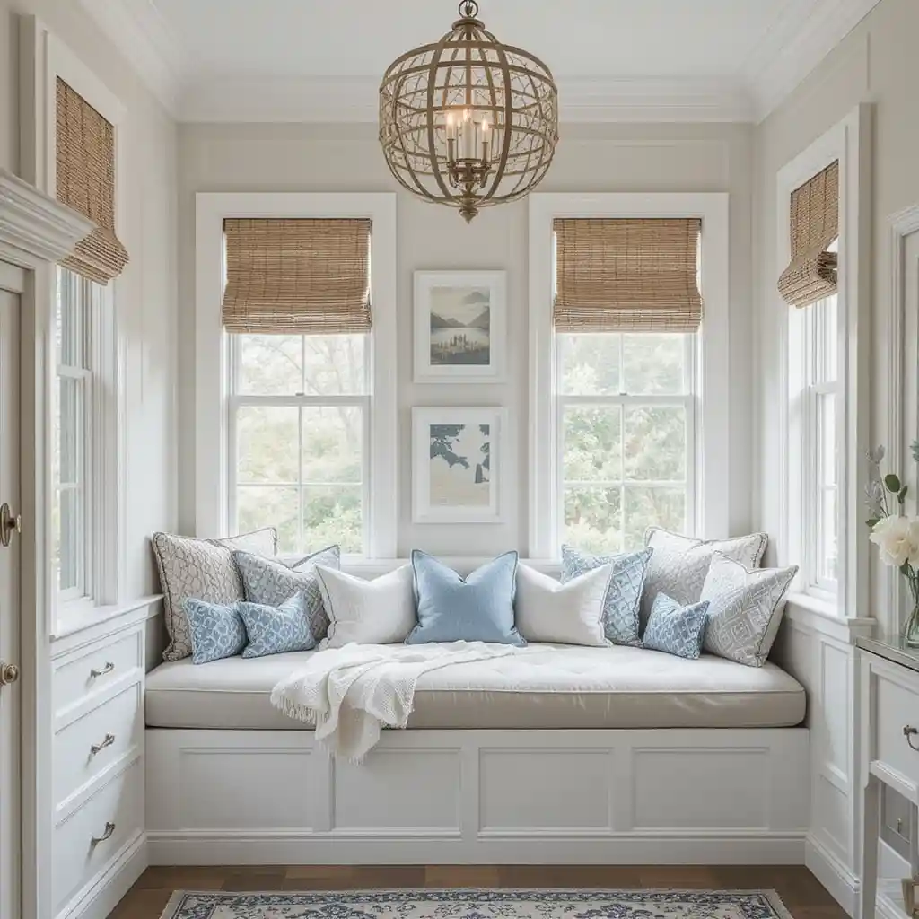 Use light blues, whites, and sandy tones with natural textures like rattan for a coastal-style nook. Works beautifully near windows or in light-filled bedrooms.