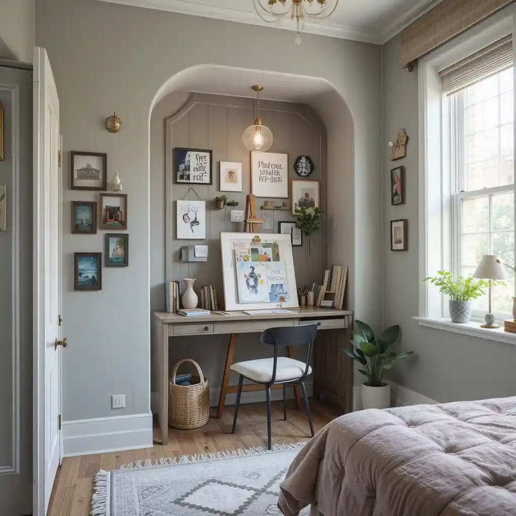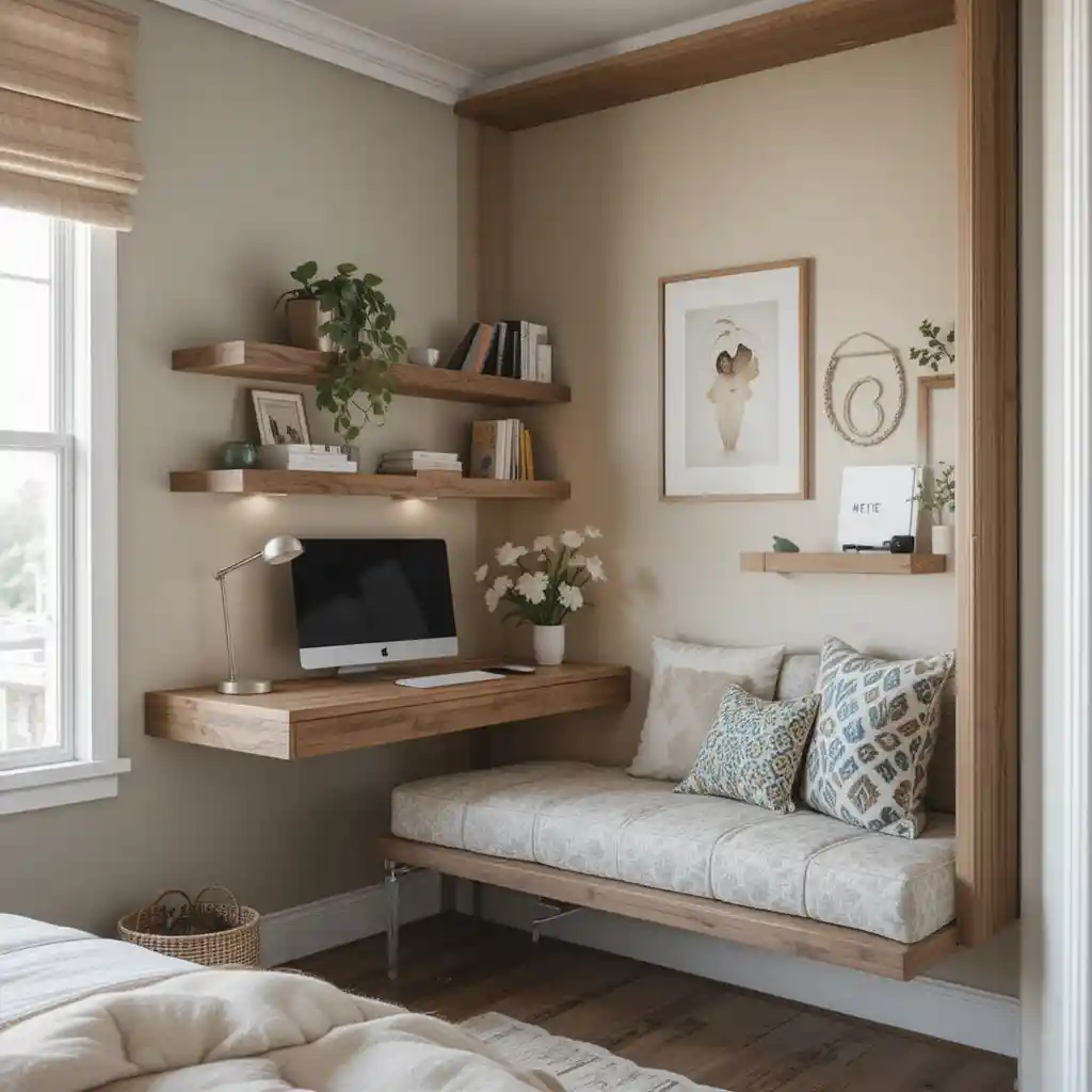 Create a compact office nook in a corner with a small floating desk and wall-mounted shelves. It maximizes space without overwhelming the room and keeps productivity in reach. Bedroom Nook Ideas