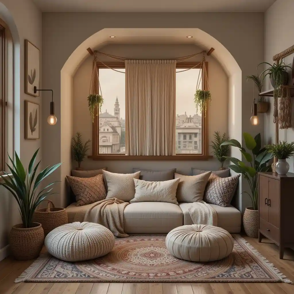 Layer floor cushions, poufs, and a small rug under ambient lighting for a bohemian nook. Add hanging plants and macramé for texture and personality.