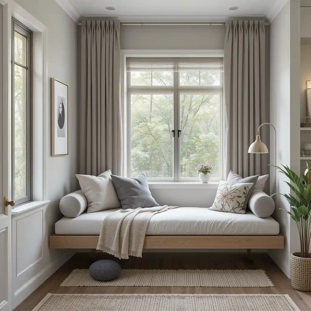 Install a floating daybed against the window wall for a sleek, modern lounging spot. Choose cushions in neutral or bold colors depending on your aesthetic. Bedroom Nook Ideas