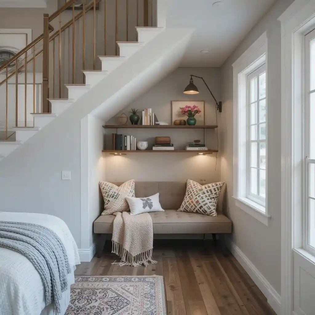 In loft-style or duplex rooms, use the space beneath stairs for a cozy reading or storage nook. Add shelves, lighting, and a bench to make it feel intentional and stylish.