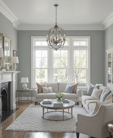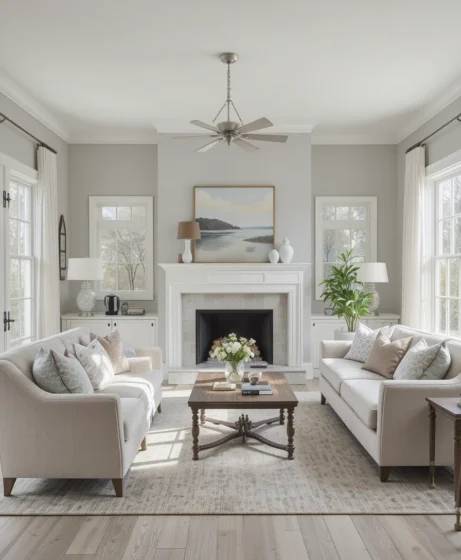 Benjamin Moore Gray Owl reflects natural light in a gentle way, keeping living rooms bright without feeling cold. It pairs well with light floors and neutral sofas for a relaxed, modern look.