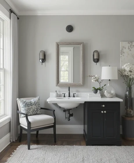 Black hardware, frames, or fixtures stand out beautifully against Benjamin Moore Gray Owl, creating modern contrast.
