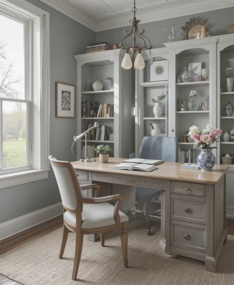 This shade keeps home offices feeling calm and professional, perfect for focused work and video calls.
