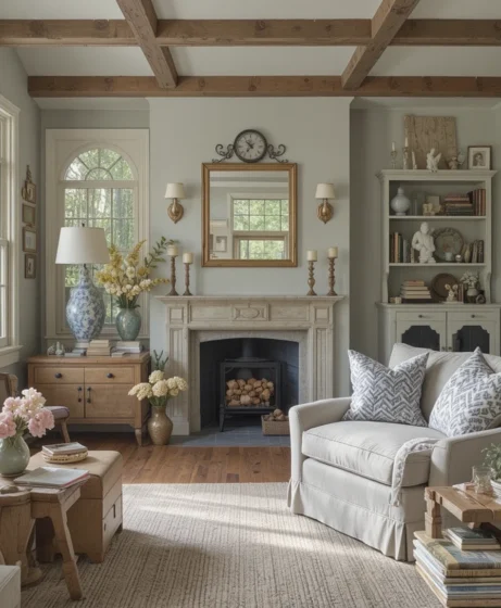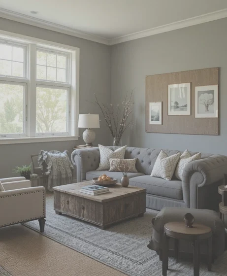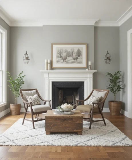 Rustic woods and vintage décor blend naturally with Benjamin Moore Gray Owl, adding charm without overpowering textures.