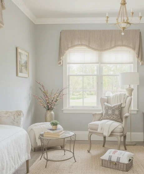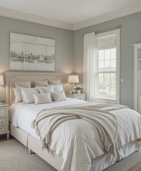 Bedrooms painted in Benjamin Moore Gray Owl feel calm and restful. The tone works beautifully with soft bedding and warm lighting.