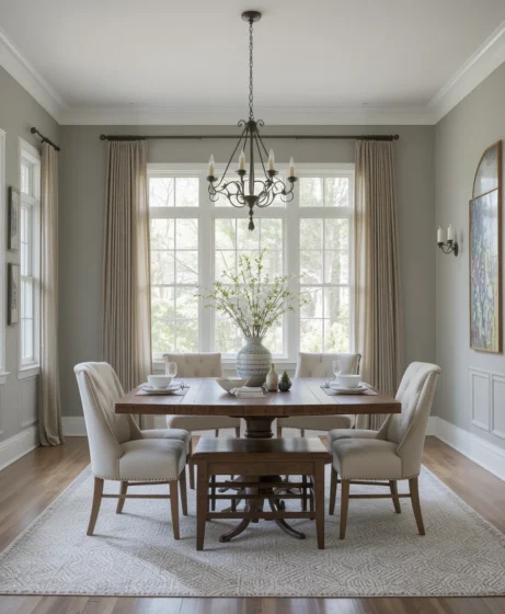 Under warm lighting, Benjamin Moore Gray Owl takes on a cozy tone that enhances dining spaces.