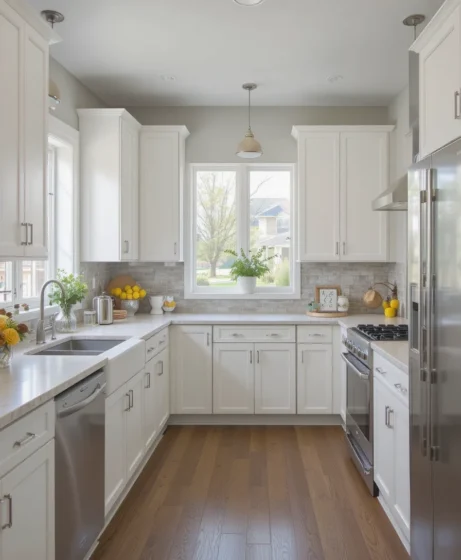 This shade provides soft contrast to white cabinets without clashing. Benjamin Moore Gray Owl helps kitchens feel airy and clean while adding subtle depth.