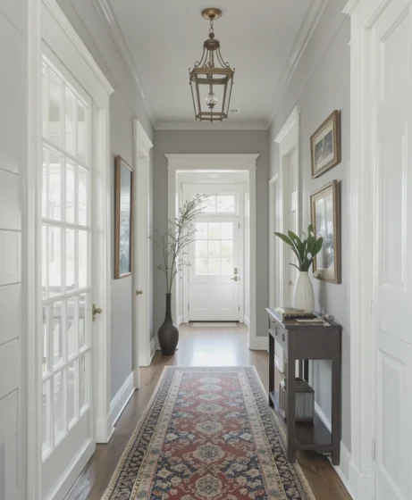 Hallways often lack light, but Benjamin Moore Gray Owl brightens them without harsh reflections. It creates an open, welcoming passage.