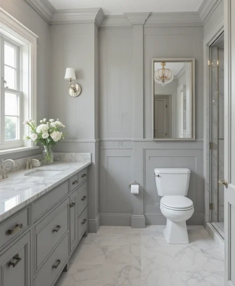 Marble countertops and tiles look elegant against Benjamin Moore Gray Owl. The combination feels fresh and timeless.