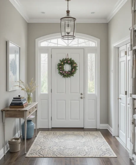 Entryways painted with Benjamin Moore Gray Owl give a neat, welcoming first impression without feeling too white.