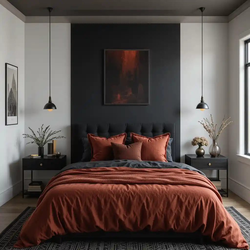 Introduce rust through your bedding—duvet covers, quilts, or pillowcases—to soften the dark tones while keeping the room feeling grounded.