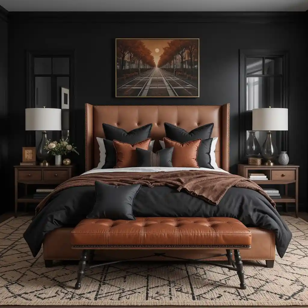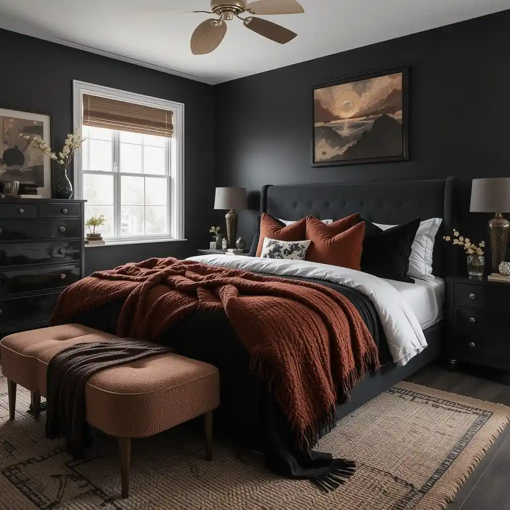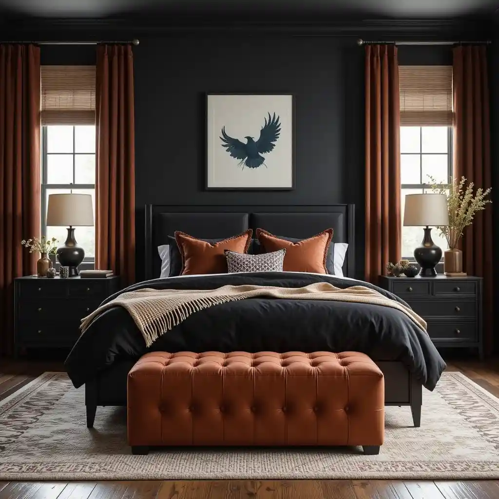 Place a rust-colored pouf or tufted bench at the end of the bed for extra seating and a cozy, coordinated detail. Black and Rust Bedroom Ideas