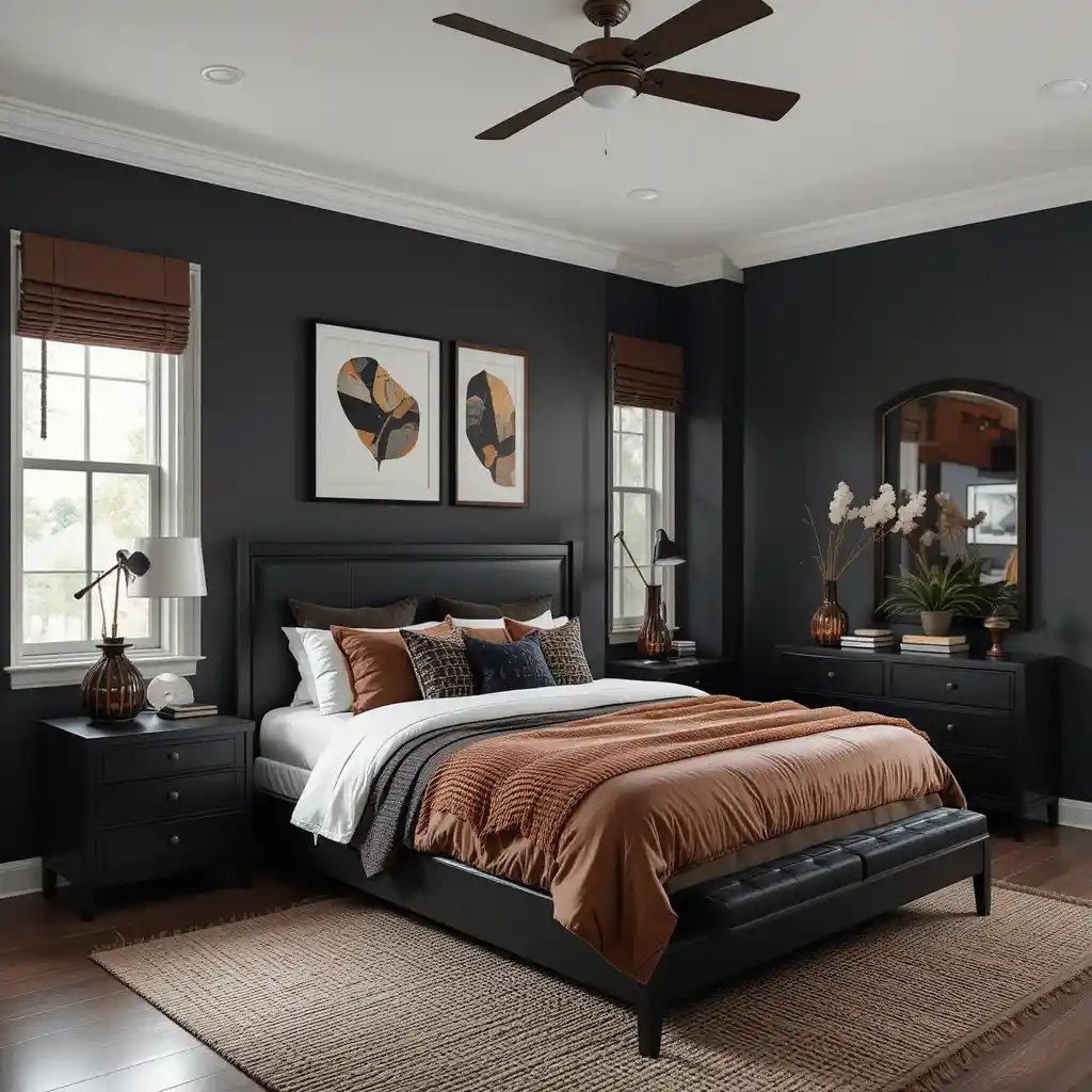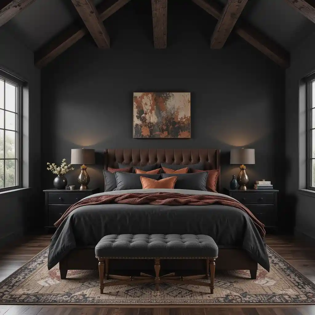 If your bedroom has high ceilings, painting exposed beams black can create structure and pair beautifully with rust accents below.
