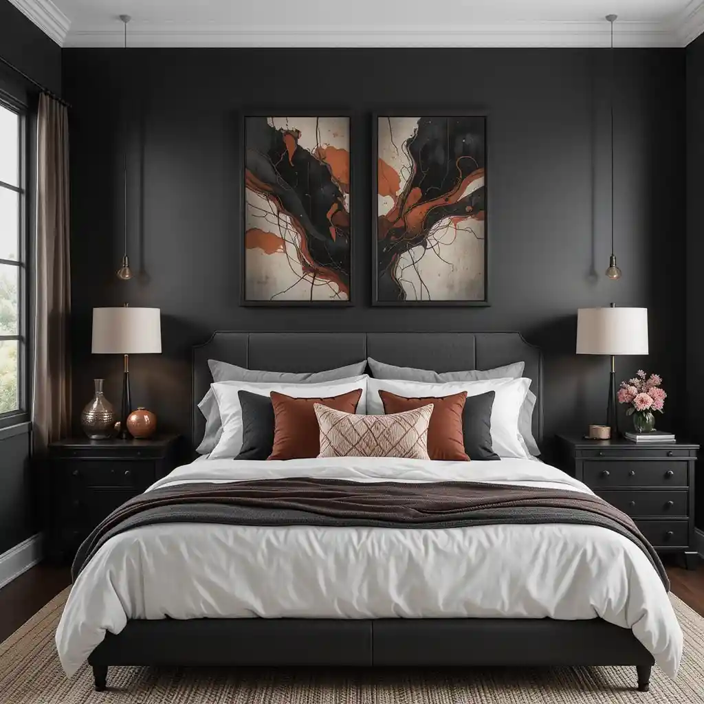 A matte black wall behind the bed sets a strong foundation for the space, creating a cozy, cocoon-like feel that complements rust accents beautifully. Black and Rust Bedroom Ideas