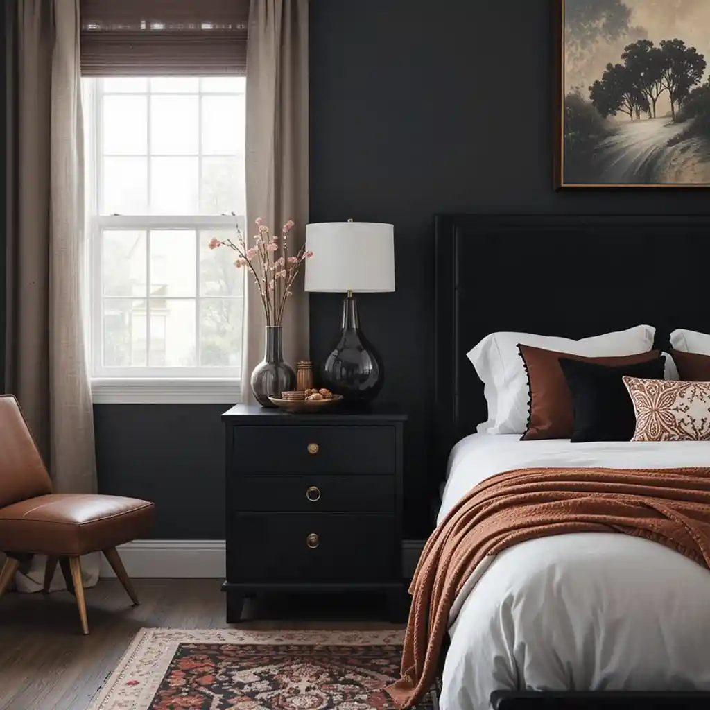 Black wooden or lacquered nightstands with brass or rust-toned pulls add a sophisticated and cohesive detail to your space. Black and Rust Bedroom Ideas