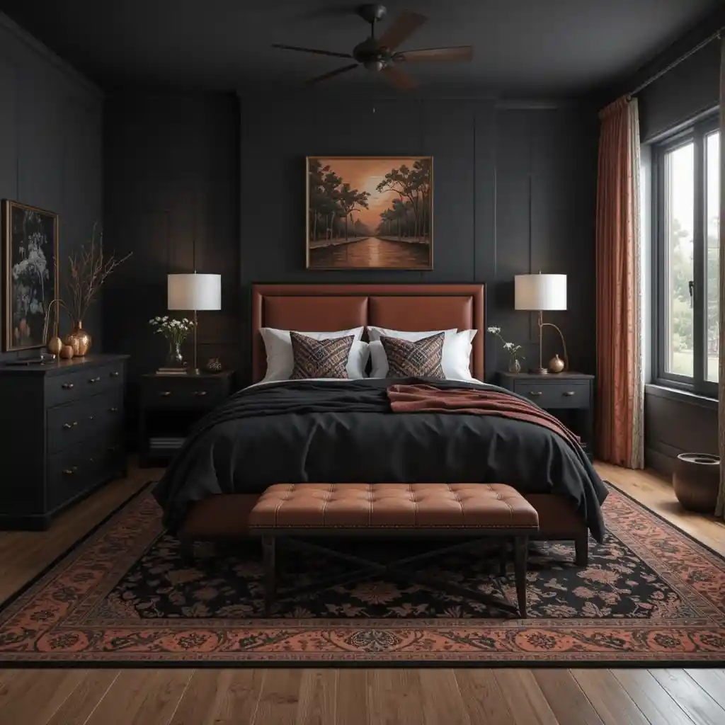 Use light wood or pale flooring to balance the heavier black and rust tones and prevent the space from feeling too dark. Black and Rust Bedroom Ideas