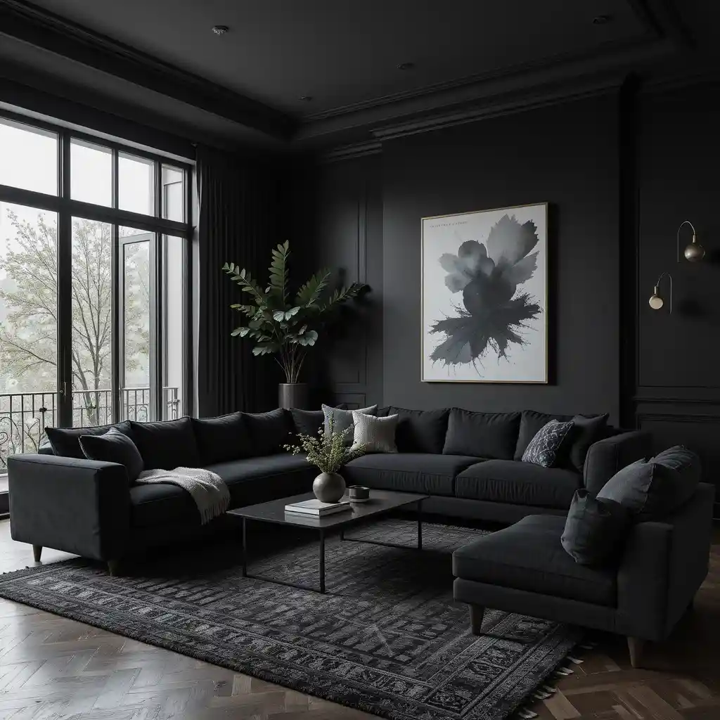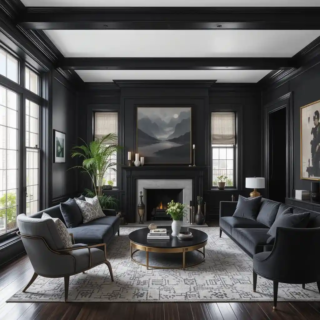 Create balance by pairing black walls with neutral-toned seating, such as cream or taupe sofas. This contrast softens the look and keeps the room feeling cozy.