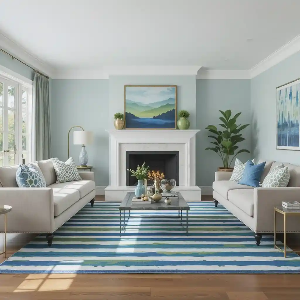 14. Blue and Green Striped Rug as the Centerpiece