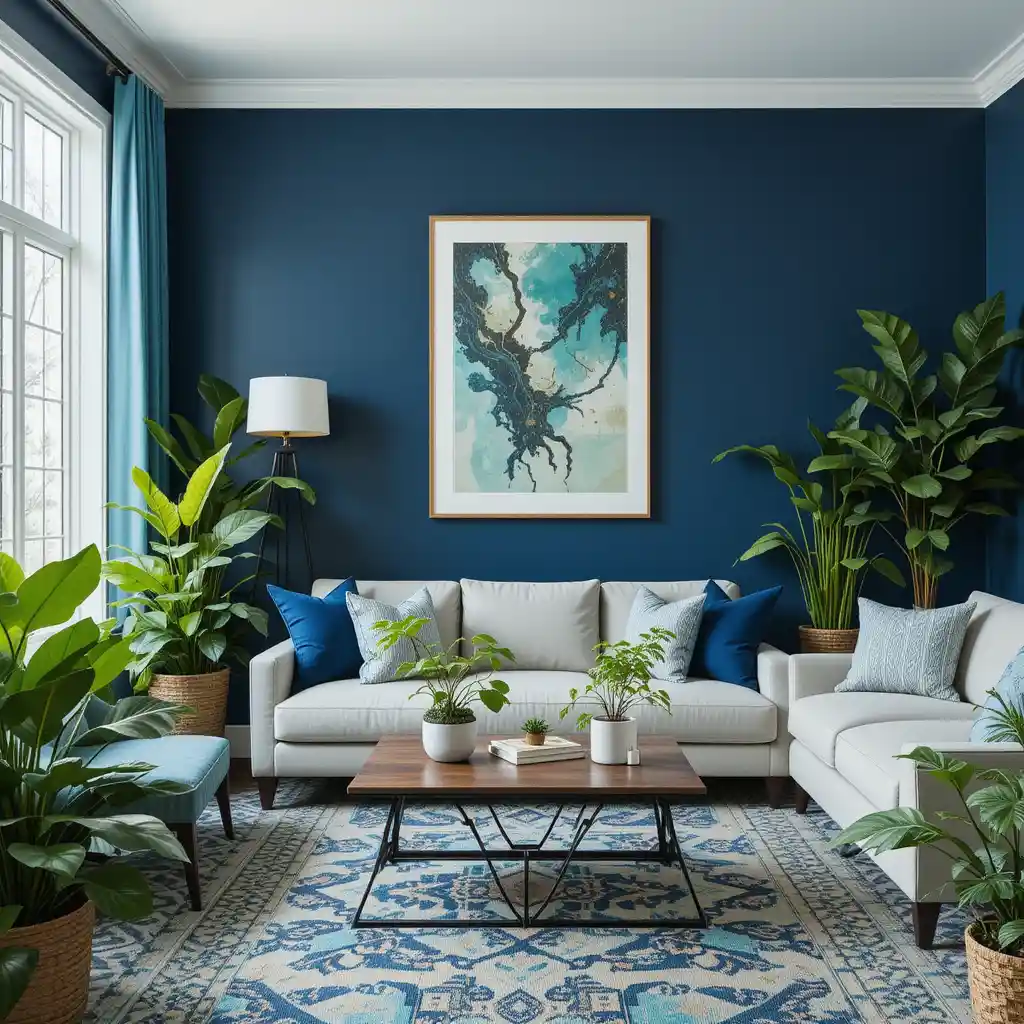 Paint one wall navy blue and fill the room with lush green plants like fiddle leaf figs or snake plants. This combo brings a bold yet refreshing feel.