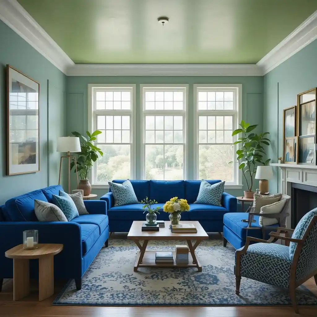 Dare to be different with a royal blue sofa and a light green painted ceiling. This unexpected pairing adds surprise and dimension to your living space. Blue and Green Living Room