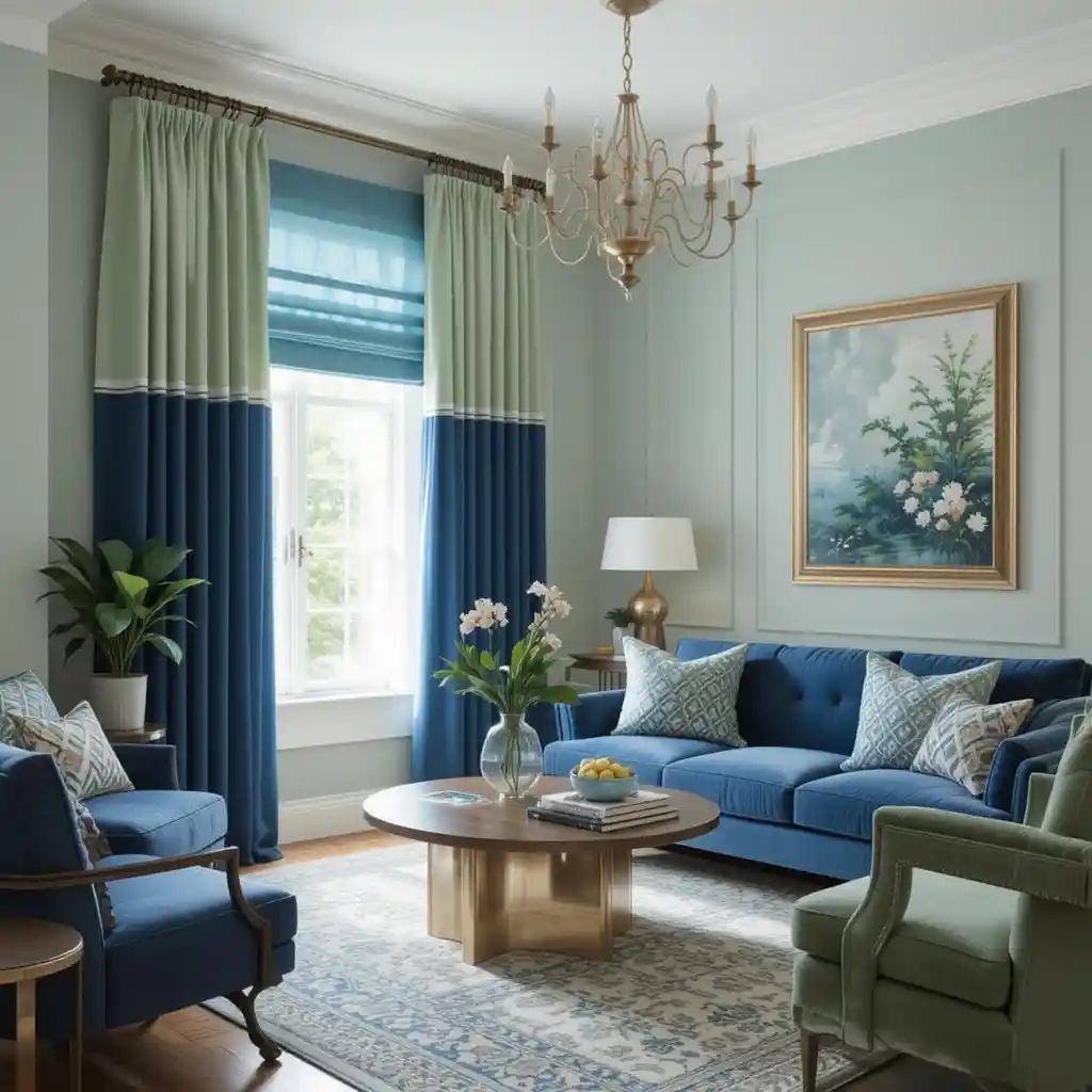 Combine double curtain layers, one in dark blue and one in pale green, for depth and sophistication. It helps control light while adding visual texture. Blue and Green Living Room