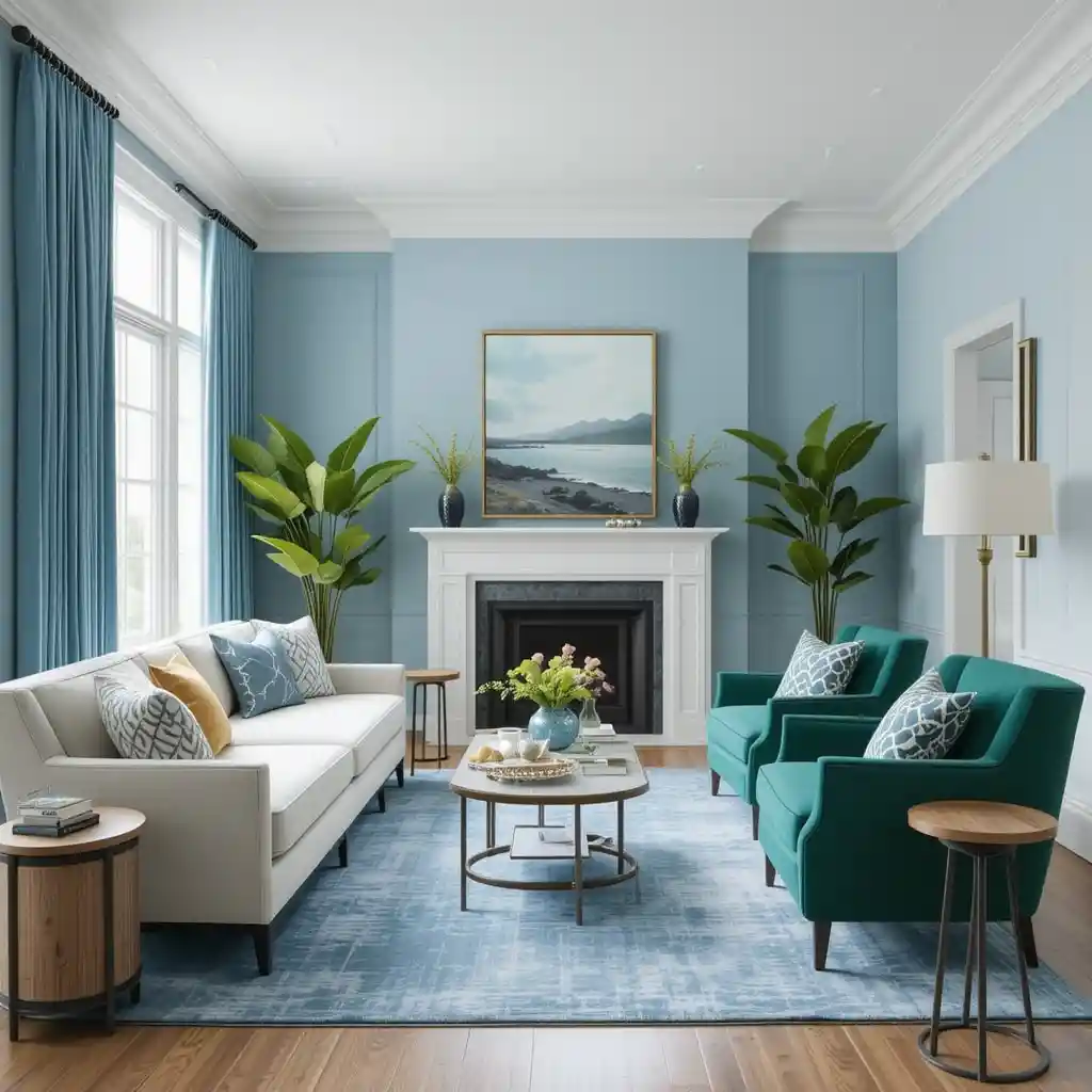 Introduce emerald green accent chairs for sophistication, then balance them with a light blue area rug to ground the space with softness.