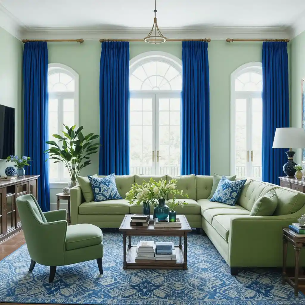 7. Light Green Sectional with Royal Blue Curtains