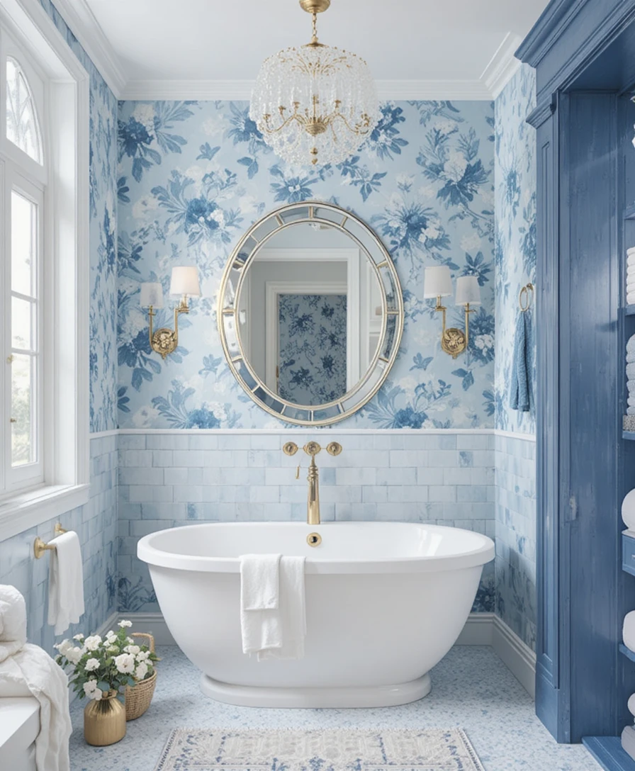Add personality with blue-patterned wallpaper featuring florals, waves, or geometric prints. Keep fixtures simple and modern so the wallpaper remains the star of the show.