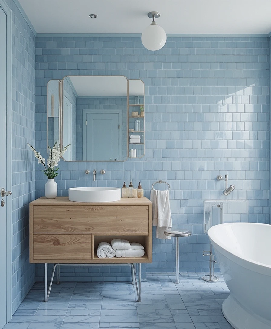 Mix sky blue wall tiles with a natural wood vanity to achieve Scandinavian simplicity. The combination feels warm, bright, and perfectly balanced. Blue Bathroom
