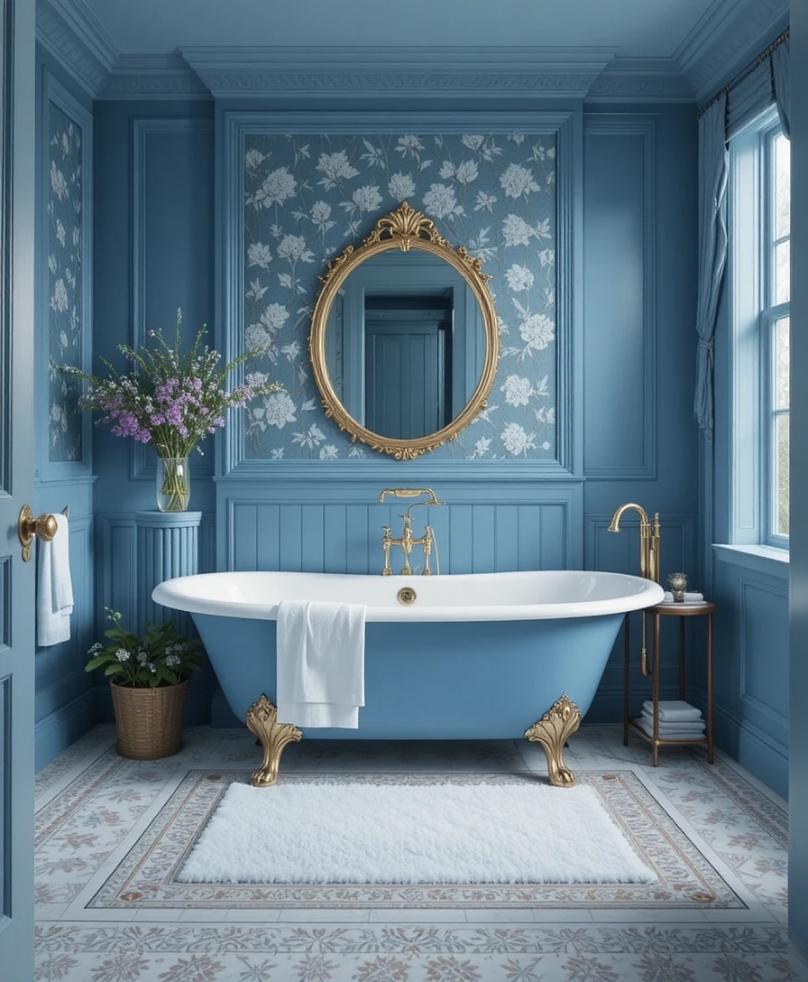 Add a powder blue freestanding tub for a vintage yet elegant feel. Complement it with brass fixtures and floral wallpaper for a charming, romantic touch. Blue Bathroom