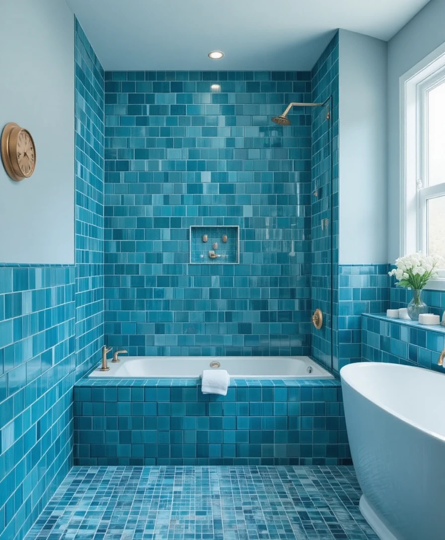 Turn your shower into a tropical escape with aqua-colored tiles. These vibrant hues mimic the look of ocean water, creating a fresh and energetic atmosphere. Blue Bathroom