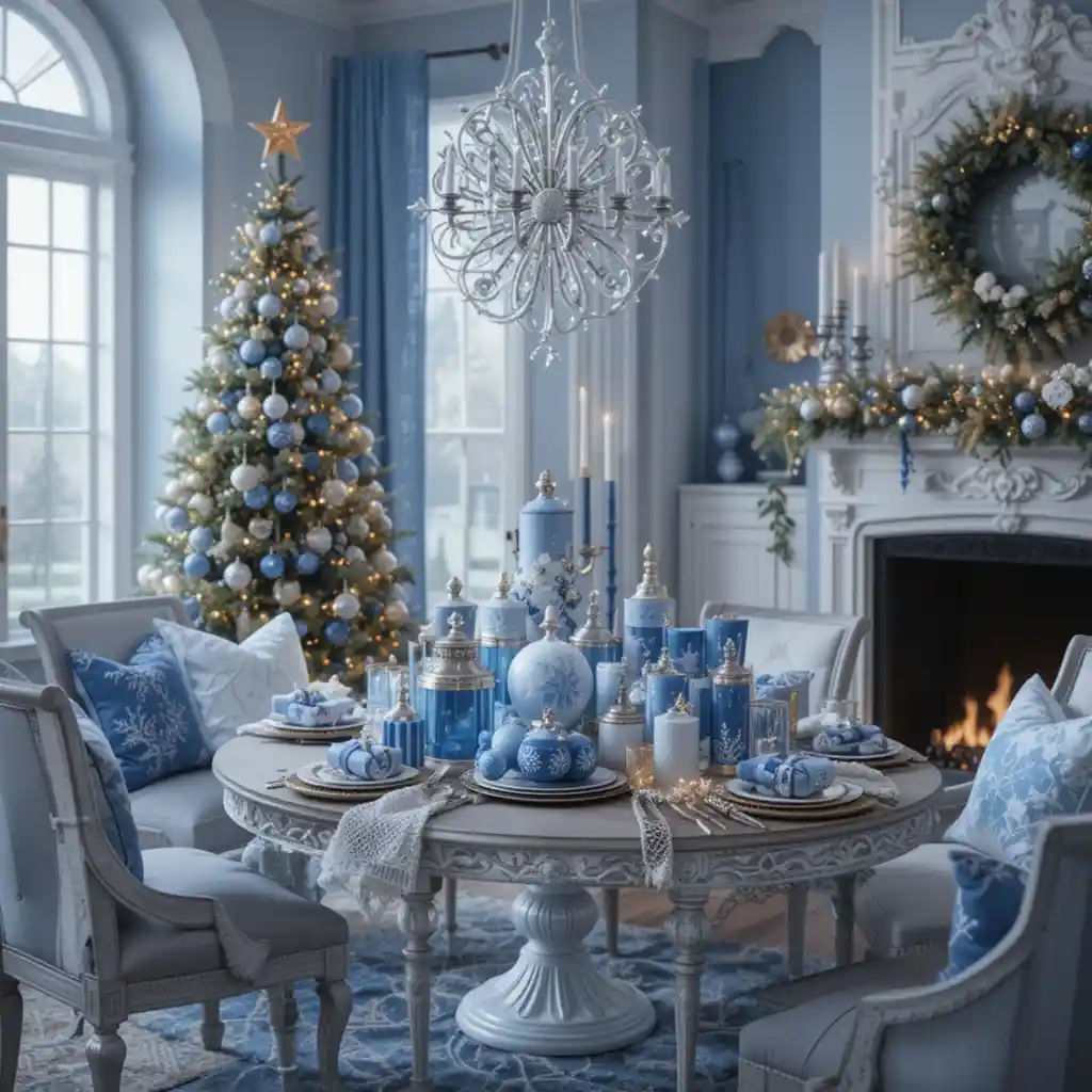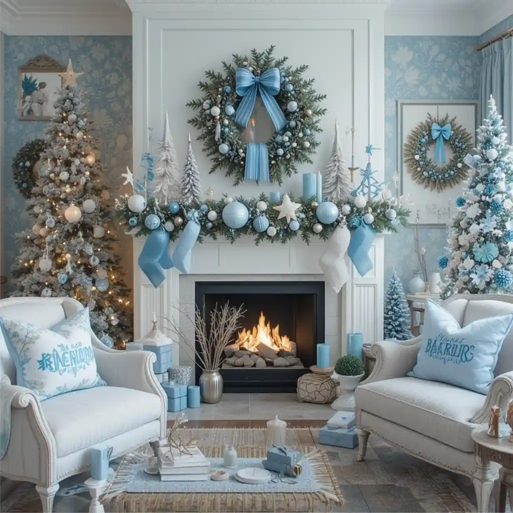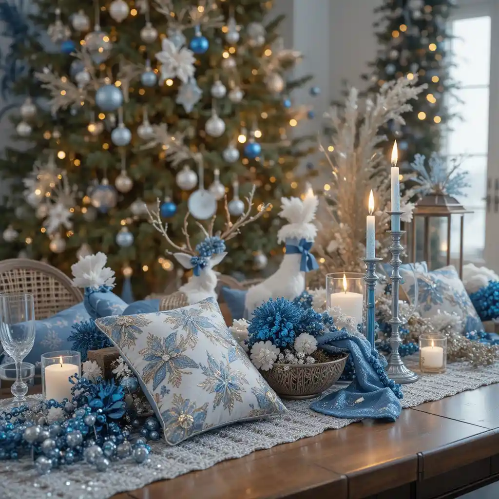 Add snowflake-themed blue ornaments, pillows, or table decor for a crisp winter wonderland aesthetic.