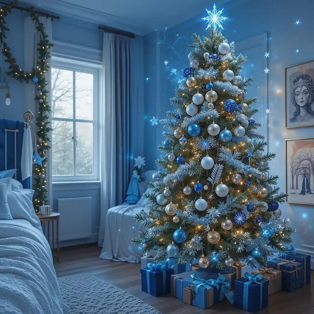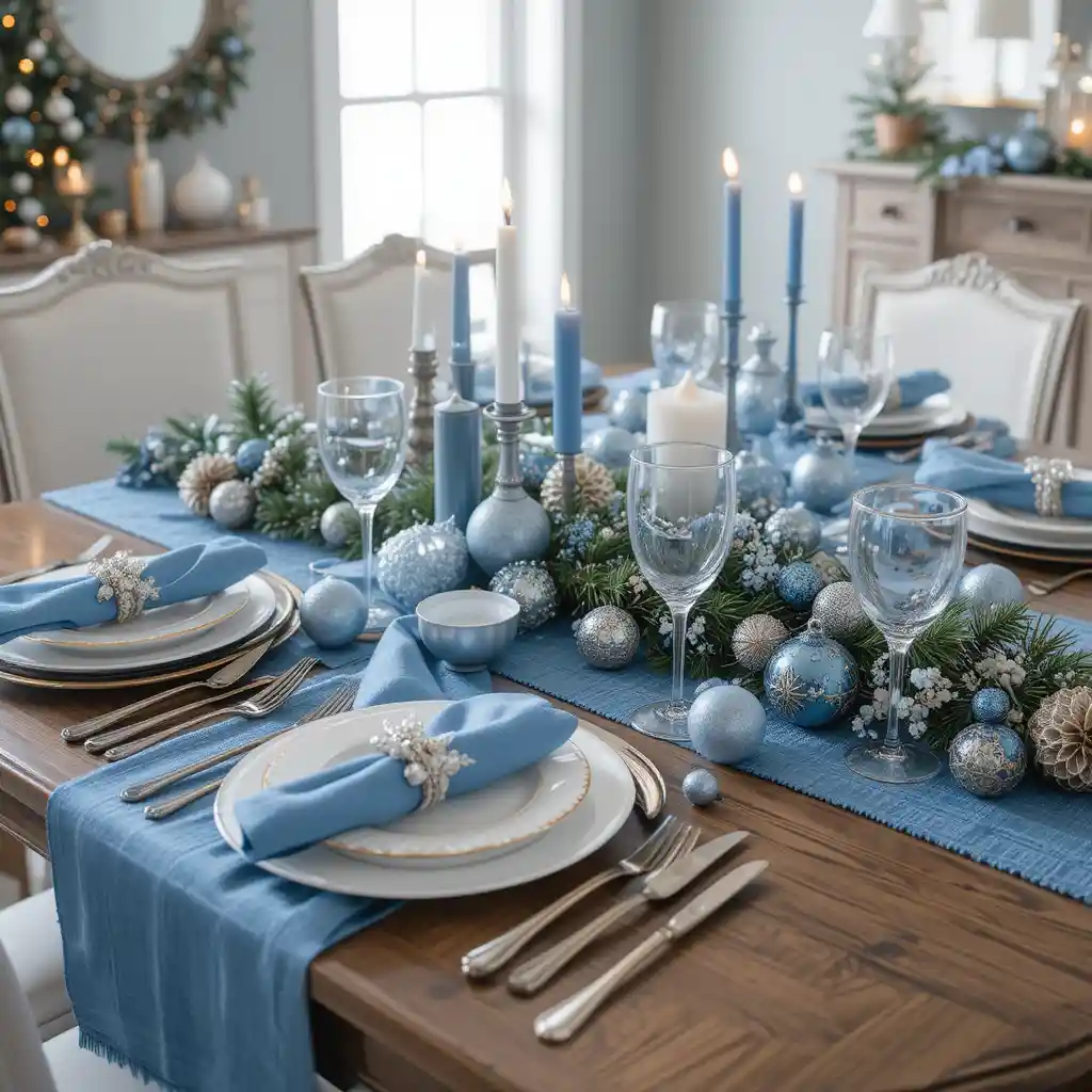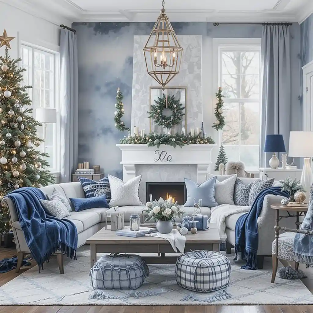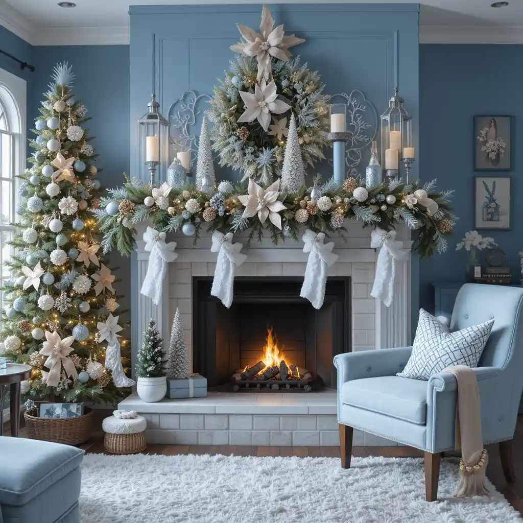 Add snowflake-themed blue ornaments, pillows, or table decor for a crisp winter wonderland aesthetic.