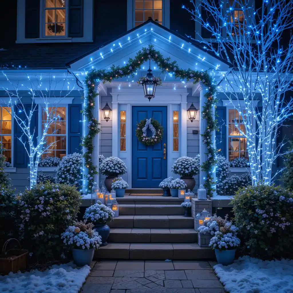 Wrap your porch, shrubs, or driveway with blue string lights to give your home a dazzling winter glow from the outside.