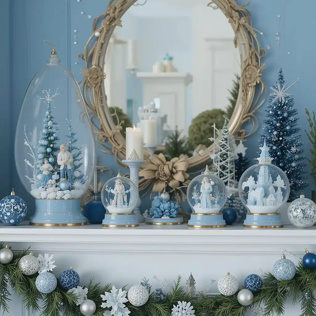 Display a set of snow globes with blue bases or snowy blue accents on shelves or mantels to add a whimsical holiday touch. Blue Christmas Decor