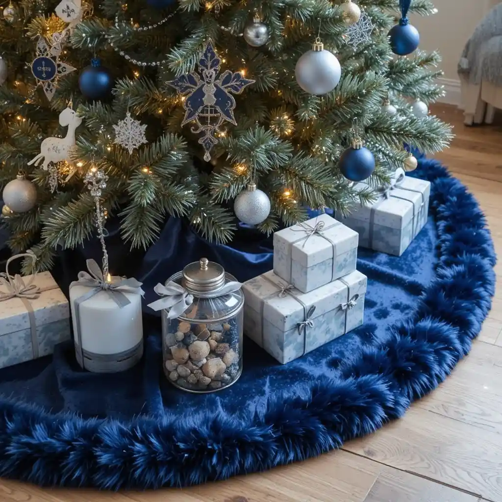 Anchor your Christmas tree with a navy blue tree skirt trimmed in fur or sequins for a sophisticated finishing touch.