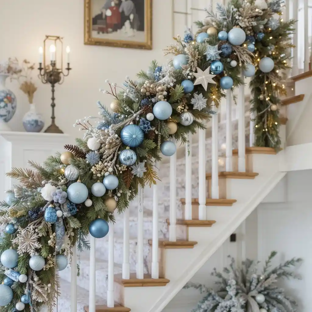 Drape your banisters or mantel with a blue-and-white garland decorated with lights, ornaments, and snowy greenery.