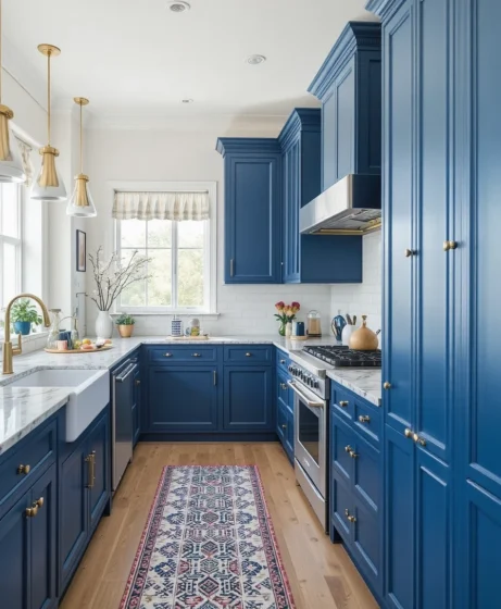 A blue kitchen rug adds warmth, comfort, and a touch of softness to the space. Choose patterns or solid colors depending on your style. It completes the room without overwhelming the design Blue Kitchen Ideas.