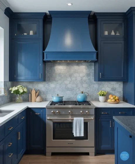 A blue range hood becomes a statement piece while blending function and design. It elevates the cooking area, especially when paired with coordinating cabinets or backsplash tiles. This detail adds designer-level flair Blue Kitchen Ideas.
