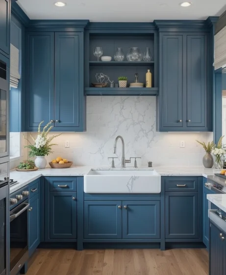 Slate blue offers a softer, more sophisticated tone than brighter blues. It works well with stone countertops, brushed nickel hardware, and glass pendant lights. This shade is perfect for homeowners seeking understated style.