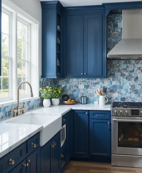 Mosaic backsplash tiles in varying shades of blue create movement and visual depth. They work beautifully in kitchens that aim for a textured, artistic feel.