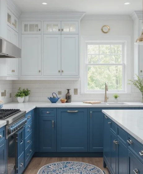 Mixing blue lower cabinets with white or light uppers helps balance bold color and brightness. This trend creates visual interest while keeping the top half of the kitchen clean and open. It’s a practical choice for both small and large kitchens.