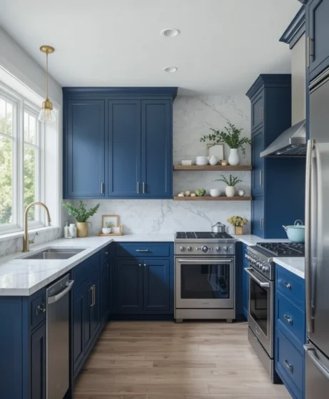 Navy blue cabinets create a bold, luxurious statement in the kitchen. Pairing them with brass handles or knobs adds instant warmth and elegance. This combination balances richness and sophistication, making the kitchen feel high-end without being overwhelming Blue Kitchen Ideas.