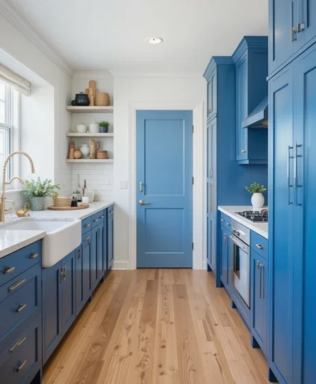 Painting the pantry door a bold blue instantly adds creativity to the kitchen. It works especially well in neutral or white kitchens where you want just a pop of color. This is a simple upgrade with major visual impact Blue Kitchen Ideas.