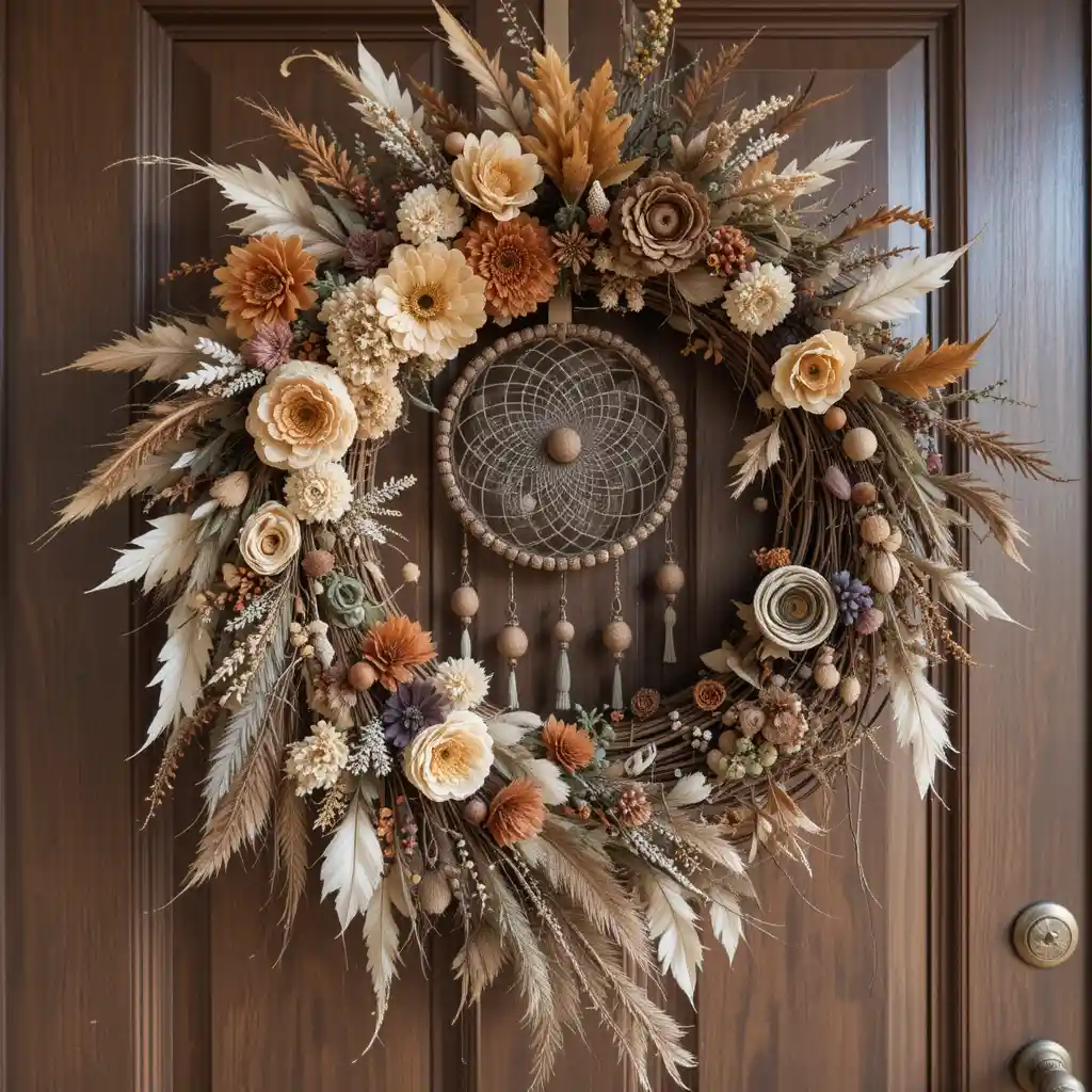 Incorporate dreamcatcher elements like lace, feathers, and wooden beads into your wreath for a whimsical, bohemian display. Boho Fall Wreath Ideas