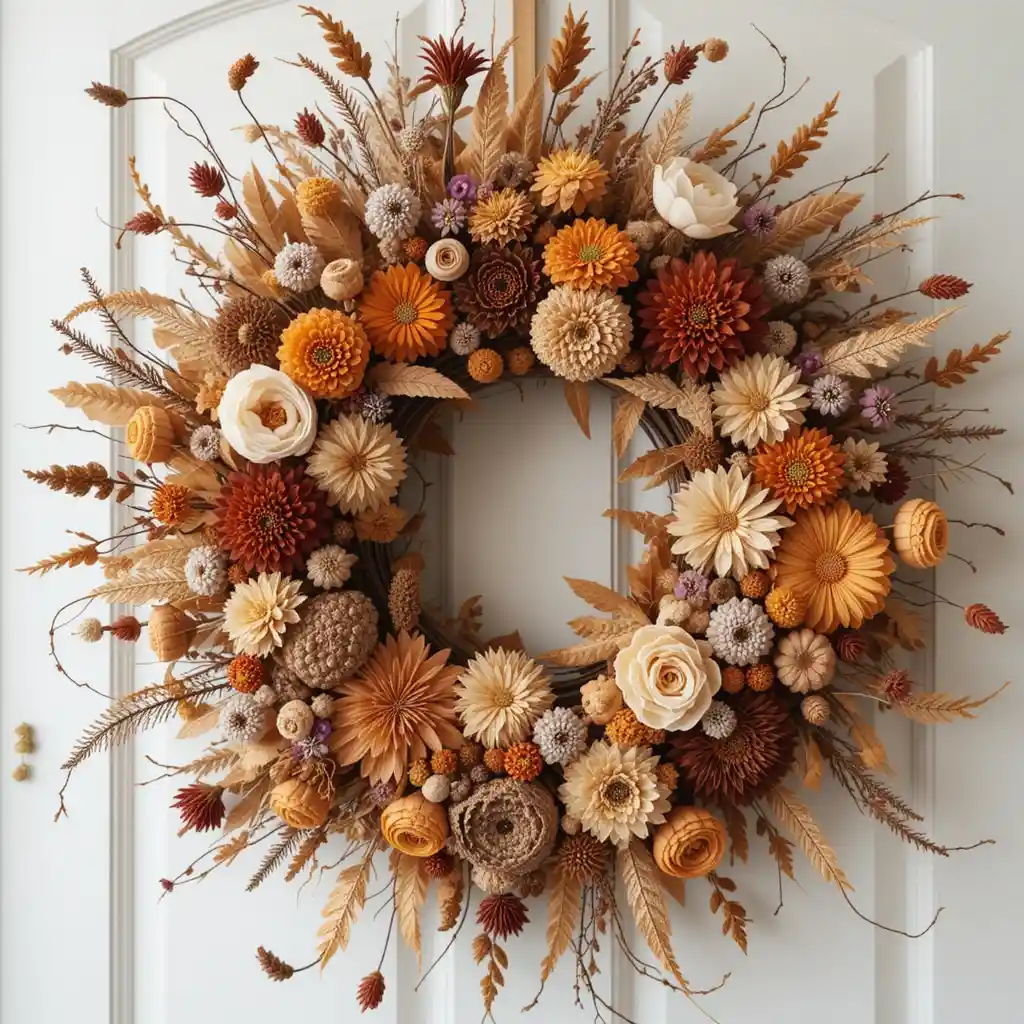 Fill your wreath entirely with dried blooms in warm fall shades—like marigolds, mums, and asters—for a lush, statement-making piece.