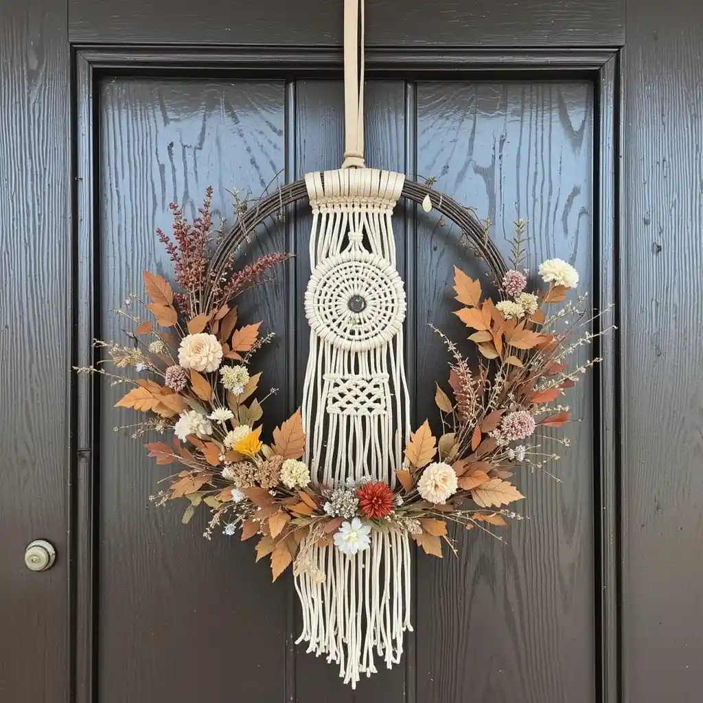 Combine a metal hoop with a handmade macrame design in the center, adding small dried flowers and autumn leaves for a soft, textured accent.