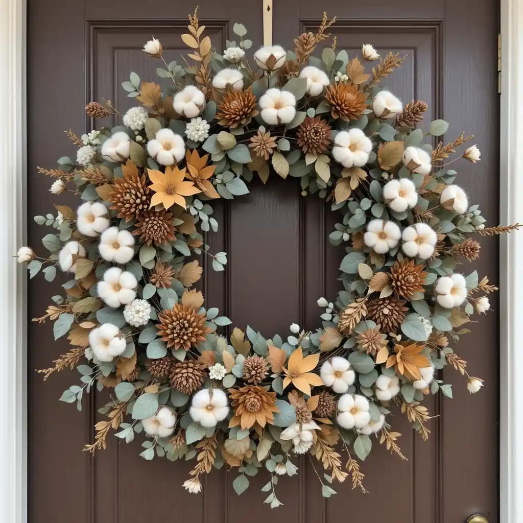Faux or dried eucalyptus combined with fluffy white cotton stems creates a light, fresh look with a touch of farmhouse-boho charm. Boho Fall Wreath Ideas