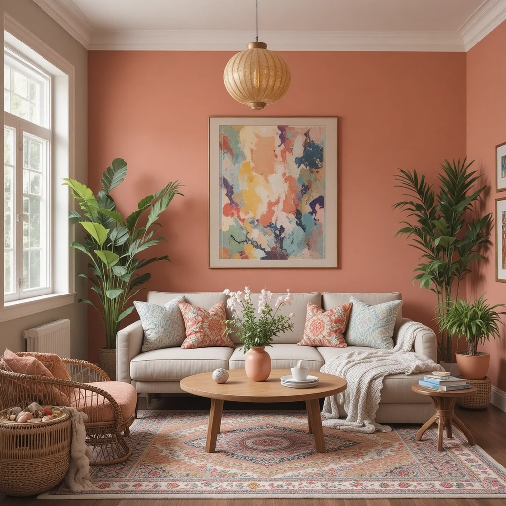 Mellow Coral brings gentle warmth and a soft, artistic vibe to bedrooms. Combine it with neutral bedding and greenery to create a serene, eclectic retreat. Boho Paint Colors
